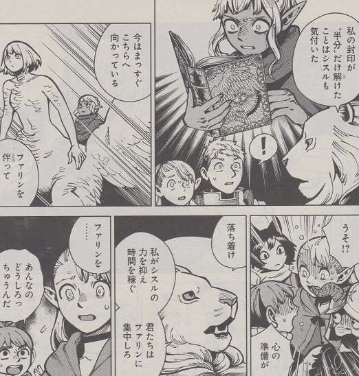 そして有翼の獅子は、実は時間がない、私の封印が半分だけ解けたことはシスルも気付いてた、今はファリンを伴ってまっすぐこっちへ向かっている、と言います。有翼の獅子がシスルの力を抑え時間を稼ぐので、ライオス達はファリンの対処に集中するように言いますが、ライオス以外はみんなファリンをなんとかする方法を思いつきません。