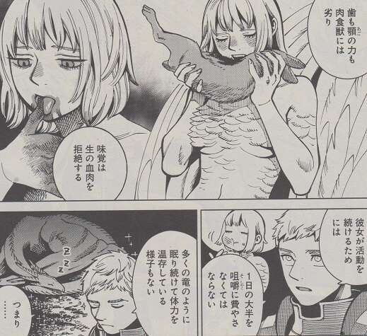 しかし、ライオスだけはひとつ確信があってそれは、ファリンは今確実に腹を空かせているという事です。ファリンの体は今、かなりデカいですが頭部はライオス達と同じサイズです。ファリンの巨体を維持するには口やのどが小さすぎる、とライオスは言います。さらに、ファリンの歯も顎の力も肉食獣には劣り、味覚は生の血肉を拒絶するなど、巨体を維持するには適さない点が多いです。よって、今ファリンは絶対に腹をひどくすかせているという、ライオスの結論です。