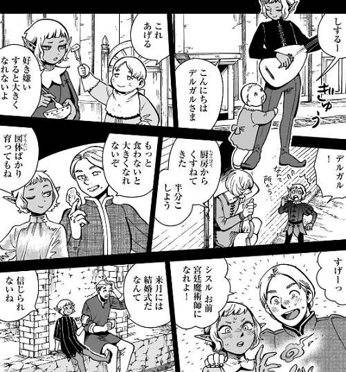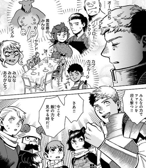 香辛料は、オークの集落でもらった香辛料、マイヅルから譲り受けた香辛料、黄金郷でもらった香辛料、シスルの家にあった香辛料、と色々な人の協力もあって完成しました。ライオスは頭の中の皆に感謝していますが、シスルだけ勝手に自分の家の食材を拝借されたのでブチギレています。ファリンを迎え撃つためこの飯を外に運びますが、その様子もシスルの使い魔が監視しています。
