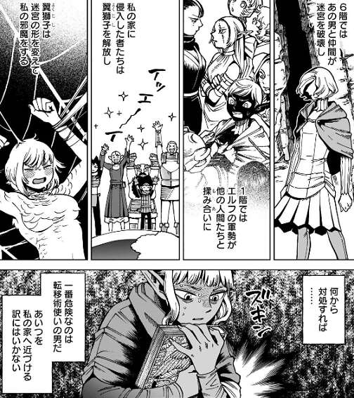 また、1階でタンス達とエルフの軍勢が揉み合いになっていましたが、シュローとリンシャが迷宮の下層に落ちて行ってしまいました。カブルーの場合は、ミスルンの転移術があったので無事着地出来ましたが、シュロー達は着地できるのでしょうか。