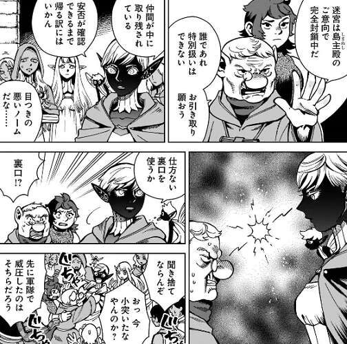 迷宮の入り口では、島主の意向で封鎖中のタンス達と上陸したエルフの軍隊とが言い争いをしています。いろんな場所で小競り合いが起きていて、シュローとリンシャがカブルーの居場所について話していると、後ろから押されてしまい何人か穴の中に落ちてしまいます。その様子を狂乱の魔術師、シスルの使い魔が監視しています。