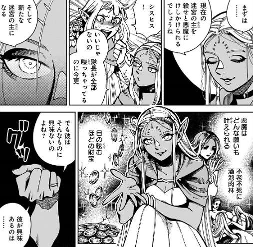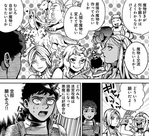 悪魔はどんな願いも叶えられるが、ライオスが興味のある願いは魔物です。魔物との交流、最強の魔物を作る、人間を魔物に帰る、むしろ自分が魔物になる、とカナリア隊は冗談?でライオスの願いをあげてみますが、カブルーはライオスなら全部願いそう!!と悪い予感しかしません。