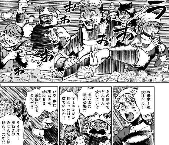 場面変わって、狂乱の魔術師の家ではライオス達が首刈りうさぎを食材にして、カレー作りに取り組んでいます。ファリンの巨体でも満足できるように、すごい量の食材をみんなで調理しています。