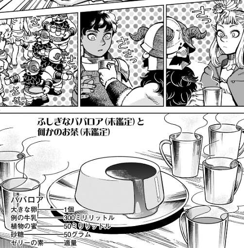 カナリア隊が上の方に探しに行こうとしますが、ライオスは茶菓子が入ったと、ふしぎなババロア(未鑑定)と何かのお茶(未鑑定)を出します。植物の蜜は、シスルが出した正体不明の植物だと思います。ゼリーはスライムで、当然のように魔物から作っています。カブルーは、センシは料理の天才だと嬉しそうな表情をしますが、心の中では魔物で作った料理を出すな、と怒り狂います。