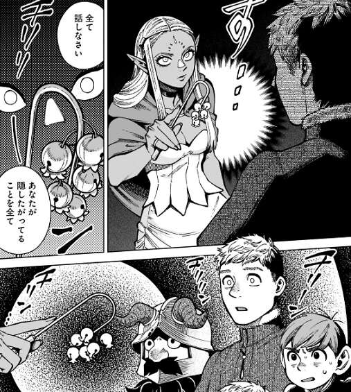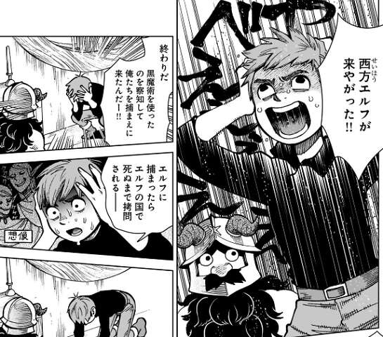 一方、チルチャックは西方エルフが来た事を知り、終わりだと頭を抱えます。黒魔術を使ったのを察知して捕まえに来たんだ、と言い、エルフに捕まったらエルフの国で死ぬまで拷問される、とチルチャックは勝手に想像します。イヅツミにマルシルと屋根裏に隠れるように言い、チルチャックはライオスが下手なことを喋らないように側につきます。