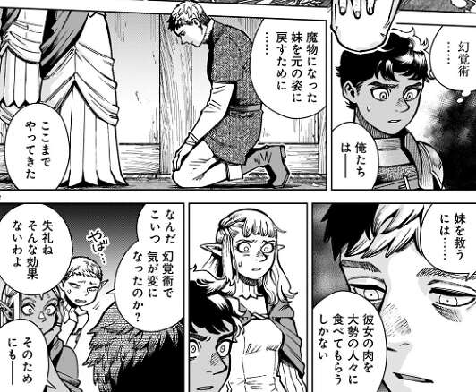 幻覚術にかかったライオスは魔物になった妹を救うためにここまで来たと言い、妹を救うために彼女の肉を大勢の人々に食べてもらおうと考えていた事を話します。しかし、話の内容が突拍子もない内容のため、オッタから幻覚術で気が変になったと疑われます。