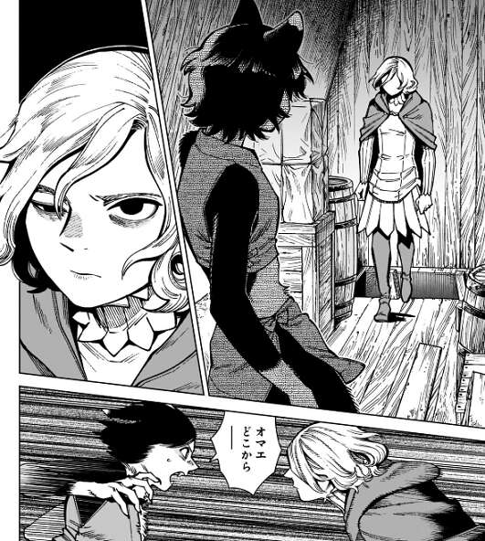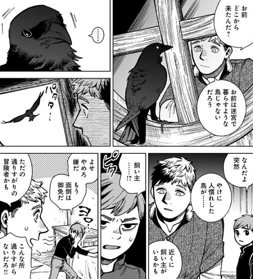 そんな話をしていると、ワタリガラスが急にライオスの前に現れ、どこかに行ってしまいます。やけに人慣れしたワタリガラスで、近くに飼い主がいるかも、とライオスが言うと、チルチャックは嫌な予感がする、とチルチャックは言い身構えます。