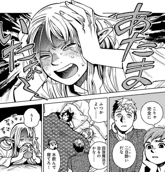 一方、マルシルはお酒を飲み過ぎたのか、二日酔いになっていて起き上がることが出来ません。とりあえずマルシルは水を飲ませて、寝かせます。チルチャックは、後はもう帰るだけと、ゆっくり行こうと言い、この旅が終わったらどうするか聞きます。センシは、今まで通りの生活を続けるつもりで、チルチャックは東方大陸のカーカブルードに戻って、店をやるつもりだと話します。