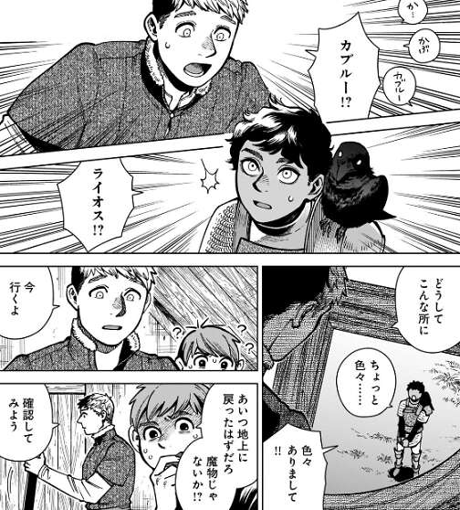 すると、ワタリガラスはカブルーの所に戻ります。ライオスはカブルーがこんな場所にいると思わず驚き、声を掛けます。チルチャックは魔物じゃないか!?と、警戒しますが、ライオスは実際に会って、魔物の擬態ではないことを確認します。