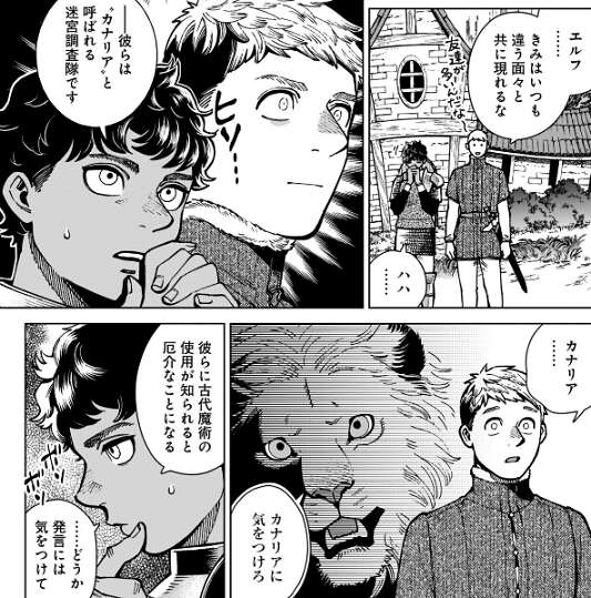ライオスはカブルーから、彼らはカナリアと呼ばれる迷宮調査隊です、と聞き、翼獅子がカナリアに気をつけろ、と言っていた事を思い出します。カブルーから、発言には気をつけるように注意され、ライオスは警戒します。