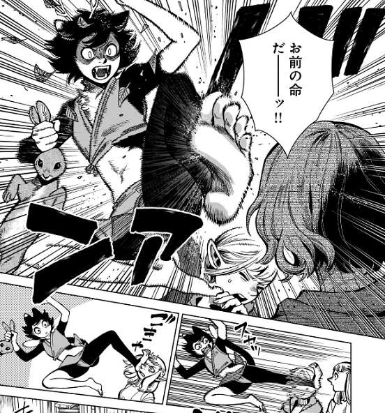本を強引に探そうとするミスルンとマルシルはもみ合いになりますが、パッタドルがミスルンをマルシルから引きはがします。するとマルシルが何か術を唱えていることにフレキが気付き、さらにマルシルのズボンの中に本があることに気付きます。気付いた時には、マルシルは既に本の封印を解いていて翼獅子 = 悪魔が姿を現します。