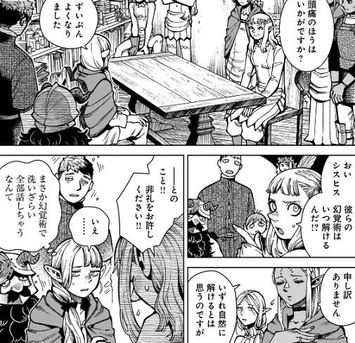 その後色々話し合ったようで、パッタドルは大変な誤解があったとマルシルに謝っています。マルシルも爆発が当たらなくて良かったと返事をします。さらにパッタドルは、ライオス達にかけた幻覚術がなかなか解けない事を謝罪します。