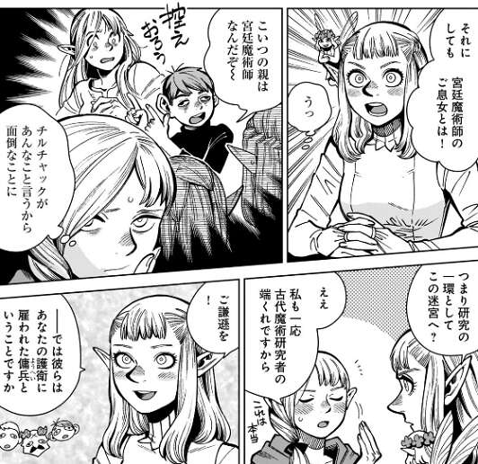 幻覚術にかかったチルチャックがマルシルの親は宮廷魔術師だと言ったのを、パッタドルは北中央大陸辺りの国家の宮廷魔術師と思い込んでいて、マルシルもそれに乗っかって話を進めます。さらに、ライオス達は自分が護衛に雇った傭兵という嘘にも乗っかってしまいます。