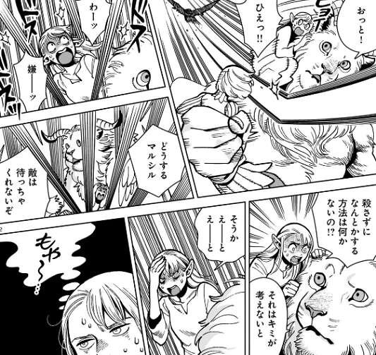 キミの敵を排除するのが先だな?と、翼獅子は言いますが、マルシルは殺して欲しいわけじゃ……、とミスルンを殺すのを止めます。その間にもフレキが鳥で翼獅子とマルシルを攻撃してきて、マルシルは殺さずに何とかする方法を必死で考えます。