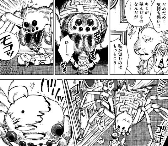 すると、大蜘蛛が現れフレキの鳥を食べて、パッタドルを蜘蛛の糸で捕らえます。マルシルは大蜘蛛に驚き、気持ち悪いと目を塞ぎますが、翼獅子はキミが望んだものなんだが……、とあきれます。マルシルは大蜘蛛の見た目だけでも変えようとしますが、顔だけかわいく変わり、かえって不気味な感じになってしまいます。