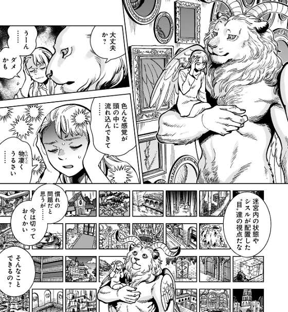 ライオス達と合流した後、ファリンを冷凍保存して、マルシルが一旦落ち着ける場所を作ろう、と今後の話をしながら移動しますが、マルシルは色んな感覚が頭の中に流れ込んでくる状態に慣れません。迷宮内の状態やシスルが配置した“目”達の視点の情報のようで、今は切っておくかい、と翼獅子は言います。そんなことできるの?とマルシルが言うと、翼獅子は切ってみせて、マルシルは少し楽になることが出来ます。