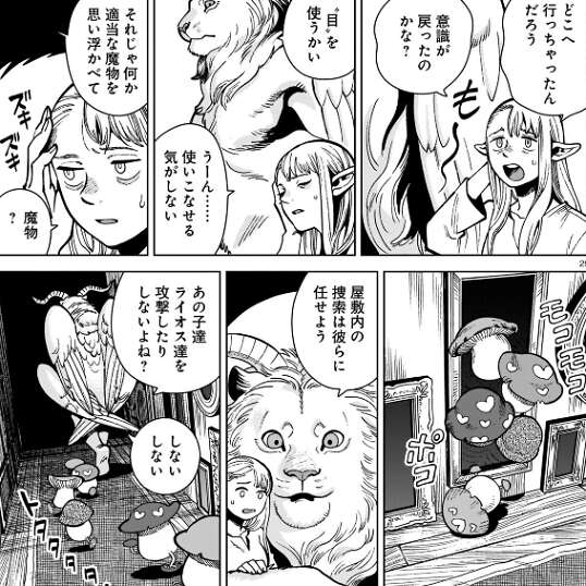 マルシルと翼獅子は元の部屋に戻ってきますが、ライオス達がいません。翼獅子は“目”を使うか聞きますが、使いこなせる気がしない、とマルシルは断ります。すると、翼獅子は適当な魔物をマルシルに思い浮かべさせます。歩き茸が出てくるとマルシルは嫌な顔をしますが、屋敷内の探索は歩き茸に任せることにします。