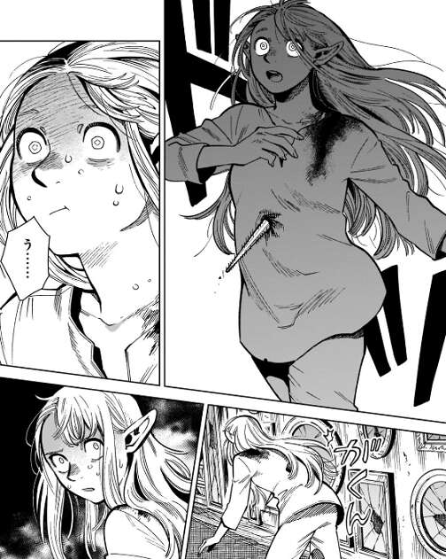 すると、前にもこんなことあったな、とマルシルは思い、マルシルの脳裏に走馬灯が駆け巡ります。1話の最初でパーティーが全滅しかけて、ファリンに救ってもらった時のこと、魔法で迷宮から脱出し今後の事を話していた時の事などを思い出します。