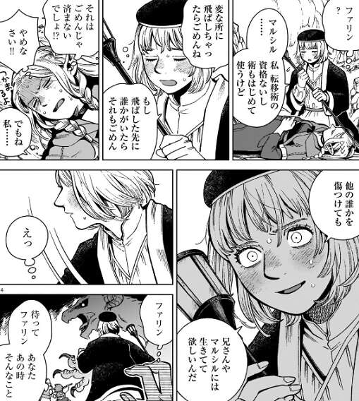 マルシルは幻覚を見抜いてさらに逃げようとしますが、ミスルンは地形が変化した物を転移させてマルシルの腹を貫きます。ミスルンは転移術でマルシルのすぐ傍まで転移し、マルシルに諦めるように言います。ミスルンに殺されるか、どこかに飛ばされる、とマルシルは死を覚悟します。