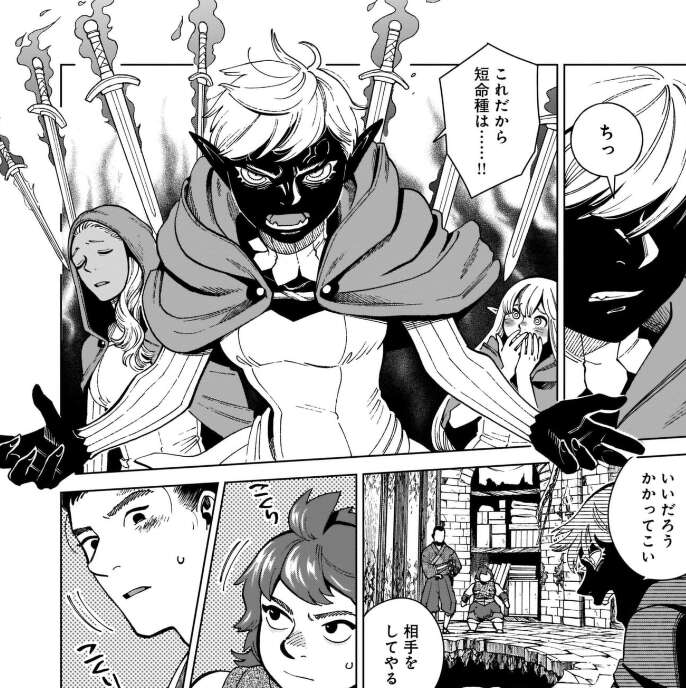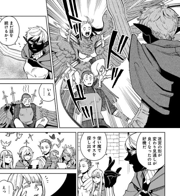 ナマリとシュローが、ライオス達が迷宮の主になりかわった?という話をしていると、カナリア隊の肌の黒いエルフ・フラメラがその話を聞き、全隊員に新たな迷宮の主・ライオスを見つけ討ち取るように指示します。ナマリが慌てて、絶対誤解があるぞ、ライオスはそんなタマじゃない、とエルフに言いますが、肌の黒いエルフは、魔物に強い憧れがある、人間社会の動向に興味がない、というライオスの情報を知っていて、ライオスを危険視します。