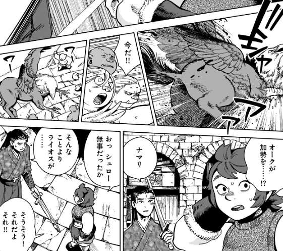 迷宮内の混乱は、襲い掛かってくる魔物をオーク達も倒すことで、大きな混乱は起こりませんでした。しかし、カナリア隊が強引に迷宮入り口を遮断しようとし、カナリア隊とナマリ達の間で小競り合いが起こります。一瞬触発の状態でしたが、ライオス達が湖で溺れていると知り、ナマリ達はカナリア隊を無視ししてライオス達との合流を優先します。果たして、ライオス達がカナリア隊の使い魔に殺される前に、ライオス達に合流できるでしょうか。