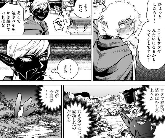 そんな暇があれば働け、使い魔を出せるだけ出しまくれ、とフラメラは怒りながら部下に命令しますが、部下のエルフ達はここがウタヤみたいになる事を懸念し始めます。しかしフラメラは、ウタヤ程度で済めばむしろ上々だ、抑え込みには成功したのだから、だが今回は……、と心の中でつぶやき悪魔が地上に出ることを懸念します。