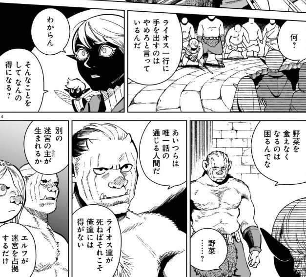 するとオーク達が、それ以上勝手な真似はやめてもらおう、と言うとカナリア隊を止めようとします。ライオスは唯一話の通じる人間で、ライオス達が死ねばオークには得がない、別の迷宮の主が生まれるか、エルフが迷宮を占拠するだけ、とオークの族長、ゾンはライオスを支持する理由する、とカナリア隊に言います。