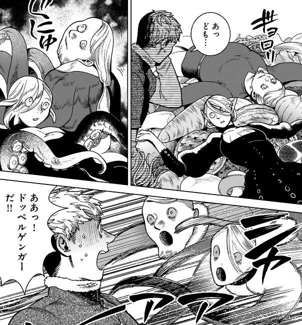 マルシルが望みそうなものを言えば、マルシルの注意を逸らせると分かり、ライオスはかわいい食器や心地いい椅子は?と、マルシルに聞きます。しかし、マルシルはお父さんにもセンシのご飯食べさせてあげたい!!と、つぶやきます。すると、マルシルの両親が落ちてきますが、本物ではなくドッペルゲンガーでした。ライオスはドッペルゲンガーに襲われてしまいますが、センシと協力して何とかドッペルゲンガーを引きはがします。