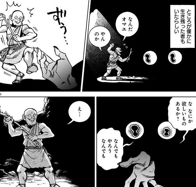 世界は滅びてしまったようですが、生き残った者もいたようで、その人間に食料を与えて、欲望を叶えてやります。