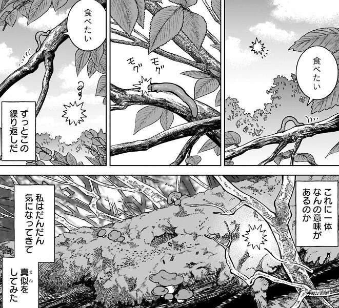 ある日、これに一体なんの意味があるのか、気になった翼獅子は真似をしてみます。生物の食べたいと言う欲望を食べてみると、これがとても美味しく、翼獅子は食欲というものを理解します。ただ、欲望を食べてしまうと生物は死んでしまい、失われてしまうことも翼獅子は知ります。翼獅子は少しずつ味わうことにします。