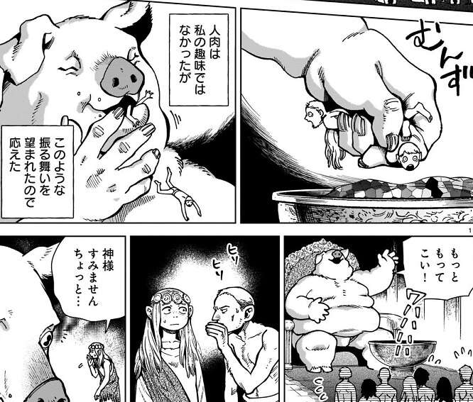 永遠の幸福を叶えてやれない、という悩みはあったものの、翼獅子は人の欲望をどんどん叶えていきます。すると、いつしか翼獅子は神として崇め奉られていきます。翼獅子にとって人肉は趣味ではありませんでしたが、人にこのような振る舞いを望まれたようで、それに応えていきます。