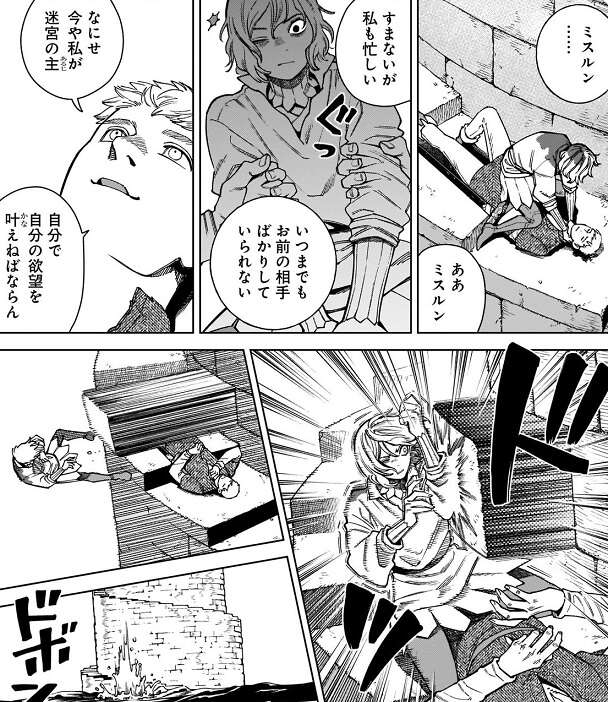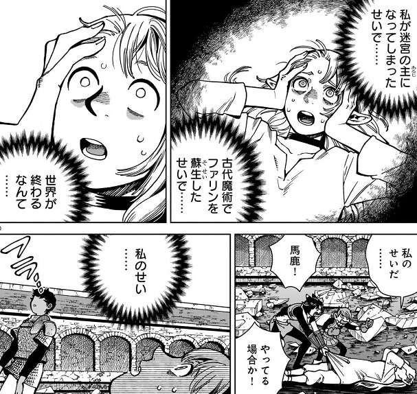 新たな魔物が再び出現し、迷宮の主になってしまったり、古代魔術でファリンを蘇生してしまったマルシルは、自分のせいで世界が終わると、自身を責めます。カブルーも嫌な予感がしていたのに、結局ライオスを殺せなかった自分を責め、自分を殺して欲しい、とつぶやきます。そんなカブルーを見たミスルンはカブルーを平手打ちし、カブルーとミスルンは喧嘩を始めてしまいます。