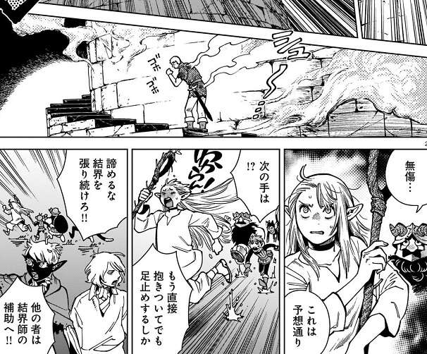 マルシルは塔を魔法で攻撃しますが、塔は無傷で翼獅子も服がボロボロになっただけで無傷です。マルシルは、塔が無傷なのは予想通り、とつぶやき、もう直接抱きついてでも足止めするしかない、と塔に走って向かいだします。一方、カナリア隊も諦めずに結界を張り続けようとします。翼獅子はマルシルの魔法攻撃を特に気にしませんが、ボロボロになった服が気になるようで、ボロボロの服からいつもの鎧の姿へと格好を変えます。