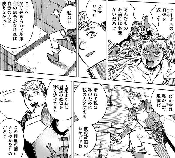 塔を登り始めたマルシル達は、ライオスの体を返して!と、翼獅子に叫びますが、翼獅子は必要だった、私はね、ここへ閉じ込められて以来主の命令がなければ自分の力を使えなかった、とマルシル達に答えます。そして、だが今は私が主で規律だ、晴れて私は私のために私の力を使える、彼の欲望のおかげでね、と気分良さそうに話し続けます。