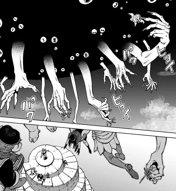 すると、空間が裂けてそこから無数の手が出てきて、みんなを掴んでいきます。そして、掴んだみんなを次々と裂けた空間の向こう側に放り込みます。その様子を見ながら翼獅子は、さあ始めよう私たちの永遠に幸福な食卓を!と、笑いながら言います。