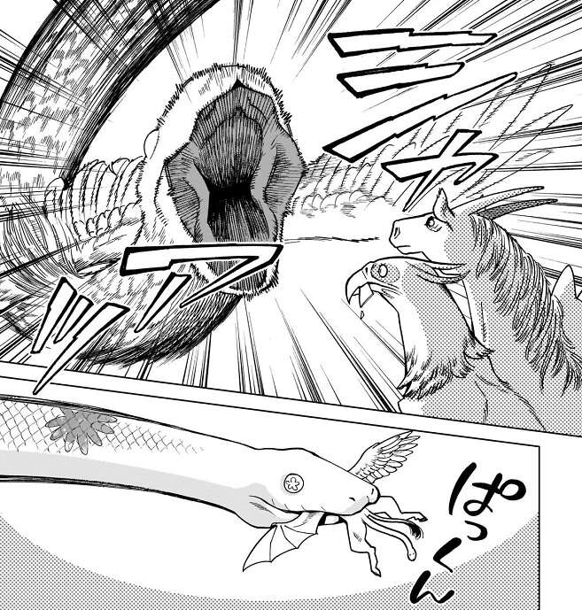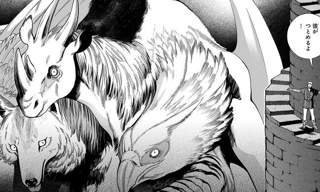 しかし次の瞬間、新たな魔物の手が翼獅子の身体をヒョイと掴みます。その状況に全員が驚いていますが、新たな魔物は翼獅子を見てよだれを垂らしています。