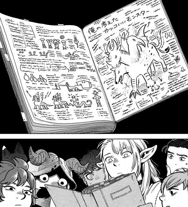 新たな魔物を見たマルシルは、ライオスのグルメブックを見れば何かあの魔物の解説が載っているかも?と、グルメブックを調べてみます。しかし、何もそれらしいものは載っていませんが、最終ページのウラに何かの記述があります。それは、「俺の考えたカッコいいモンスター」という、ライオスが考えた魔物を記述したページでした。