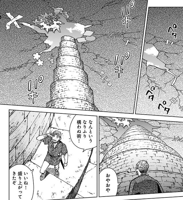 その後少し冷静になったマルシルは、まずは魔物になった?ライオスは一旦置いておき、直接翼獅子の足を止めようと、塔を魔法で破壊しようとします。