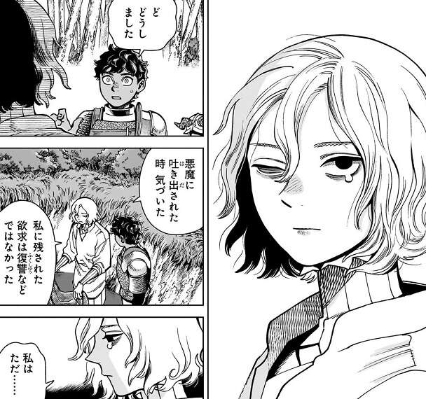 順調に竜部分を刻んでいき料理の準備が進みますが、ミスルンは休憩もせずに竜部分を刻んでいき、心配したカブルーは休憩するようにミスルンに話しかけます。しかし、それでもミスルンは転移術を止めようとせず、カブルーはミスルンを無理やり止めようと肩に手を掛けますが、ミスルンが涙を流している事に気付き驚きます。ミスルンは、悪魔に吐き出された時に気付いた、私に残された欲求は復讐などではなかった、ただ……完食されたかったのだと思う、と言い、今の私は皿の上に残された最後のひと口、まな板の上の野菜屑、と自分を卑下したように表現します。