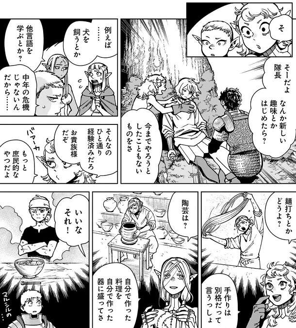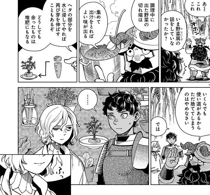 ファリンの竜部分を皆で一緒に食べる為に、料理の準備を始めます。一方、カナリア隊のミスルンは悪魔を退治してしまった事で、抜け殻状態となってしまい最初は何をしても反応がありません。しかし、カブルーの説得とカナリア隊のメンバーの呼びかけにより、反応するようになり、ライオスの料理の手伝いもやるようになります。最後はセンシの勘違いから、野菜屑にも使い道がある、捨ててしまうのはやめさない、とセンシに言われますが、その話がミスルンには響いたようで、新しい人生の一歩を踏み出す気になったようです。ミスルンにいつか、新しい欲求が見つかるといいですね。