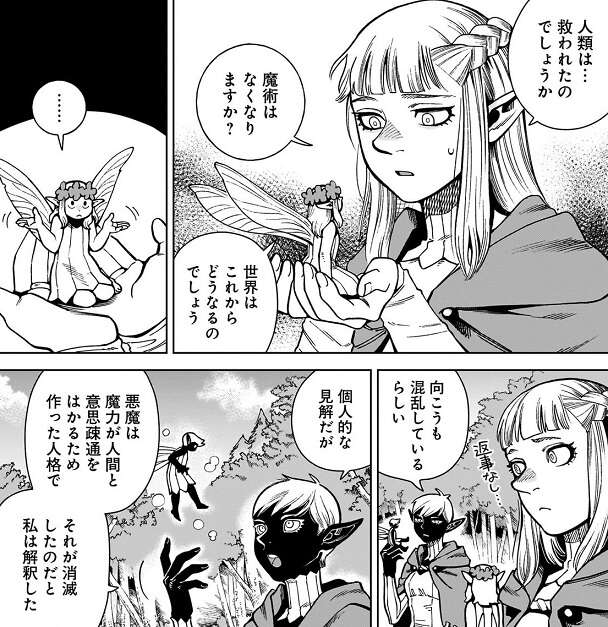 ライオスは皆と協力して料理の準備を始めます。皆に指示を出すライオスですが、お腹が空いて、ぎゅるるる~、と大きな音を出して皆に笑われてしまいます。その様子を見ながらカナリア隊のパッタドルは、エルフの女王に連絡用の妖精を通じて話しかけます。これから魔術はなくなるのか?世界はどうなるのか?不安なパッタドルですが、女王から返事はなく、エルフの国も混乱しているようです。不安なパッタドルにあくまで個人的な見解と前置きしたうえで、悪魔は魔力が人間と意思疎通を図るために作った人格で、それが消滅しただけだから世界から魔力や魔術が失われる事はない、とフラメラは言います。