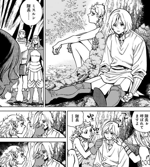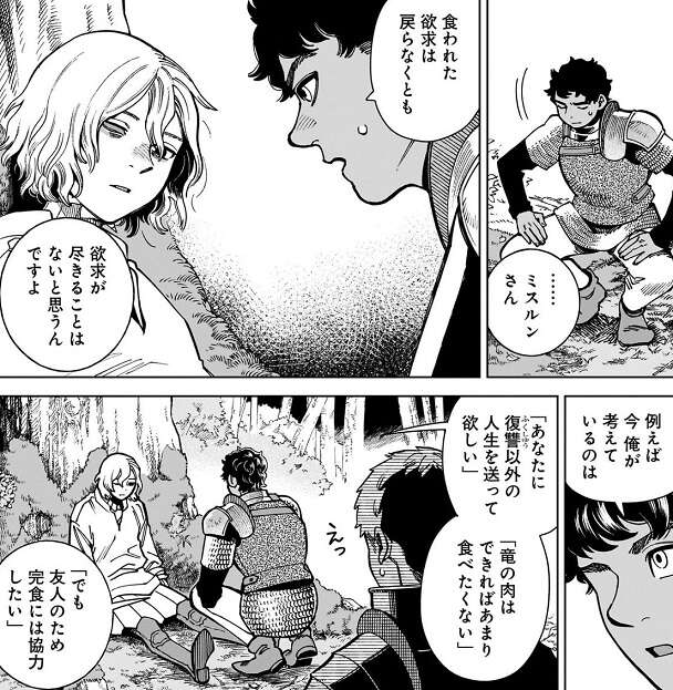 カブルーはミスルンに欲求は尽きる事はないと思う、と言い、今自分が考えている事を一つずつミスルンに話します。竜の肉はできればあまり食べたくない、とカブルーが言ったところで、ライオスには意外だったのか、えっ、ライオスは驚きます。それでもカブルーは話を続けて、厄介なことに生きてる限り欲求は生まれ続けるもんだとミスルンを説得すると、ミスルンの指が少し動きます。