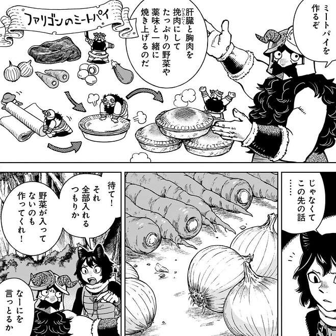 センシはミートパイを作ろうとしている最中で、まずはたっぷりの野菜の下ごしらえをしようとしていました(ファリゴンとあるのは、「ファリン+ドラゴン」の肉だからファリゴンと言っているのかな?)。イヅツミはミートパイに野菜を入れると知り、野菜が入っていないミートパイも作ってくれ、とセンシに言いますが、今回は食材や調理道具の配分を密に決めてある、とセンシは言い野菜をミートパイに入れる事を譲歩しようとしません。