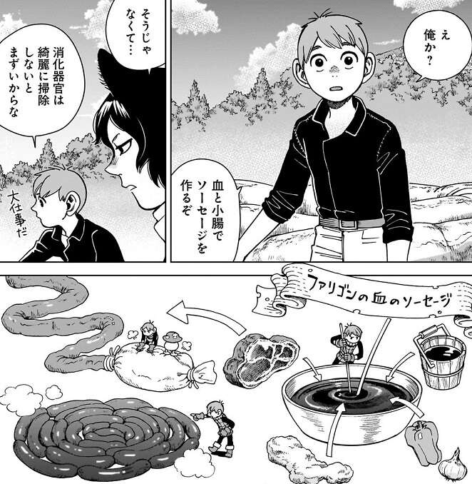センシがゾンの説得を受け始め話が出来なくなったので、イヅツミは次にチルチャックに今後何をするのか聞きに行きます。チルチャックは血と小腸でソーセージを作っている最中で、食材をきれいに下ごしらえしていました。