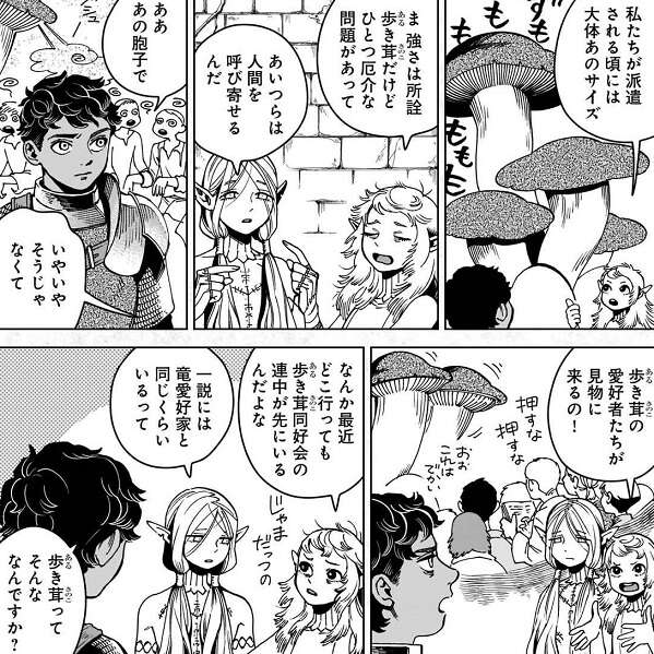 歩き茸とスライムはどの迷宮にでもいるようで、環境にも影響されやすいので、歩き茸とスライムを見ると迷宮の状態も分かるそうです。また歩き茸は人間を呼び寄せるそうで、カブルーは胞子で呼び寄せるのだと思いましたが、実は歩き茸には愛好者たちがたくさんいて見物に来るそうです。