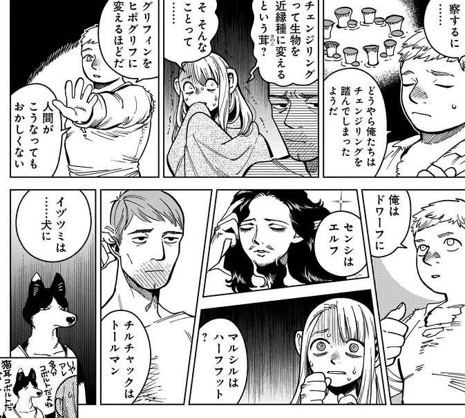 ライオス達は迷宮の奥に歩みを進めている途中で、高熱を出して寝込んでしまいます。やっと熱が引いて目が覚めると、ライオス達は体の異変に気が付きます。どうやら全員、チェンジリングを踏んでしまったようで、ライオスはドワーフに、センシはエルフに、マルシルはハーフフットに、チルチャックはトールマンに、イヅツミはコボルトに人種が変わってしまっていました。