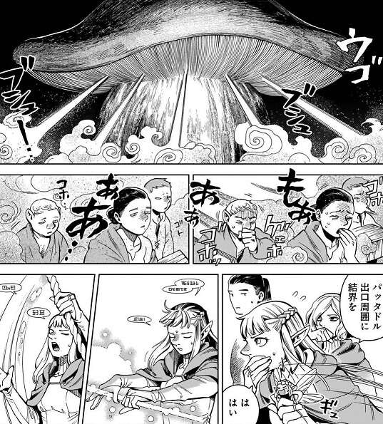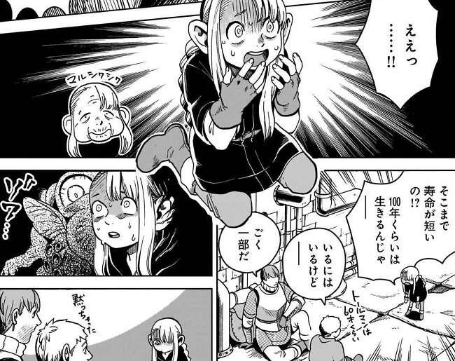 全員、人種が変わって変化後の体に四苦八苦していて、迷宮を進むペースが上がりません。仕方なく休憩を取りますが、休憩中の会話の中で今の姿だと寿命まで変化後の姿に準じるのではないかと言う話になり、長寿種のマルシルはハーフフットの平均寿命の短さに恐怖します。