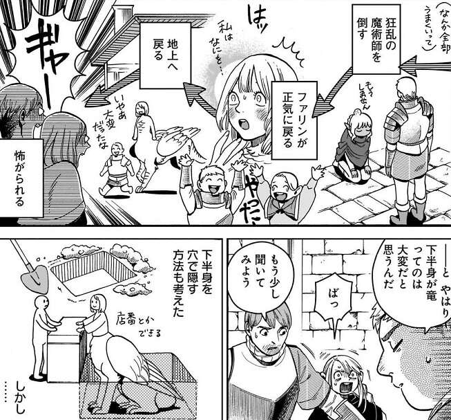 ライオスはチェンジリングの変化を何かに使えないか考えていて、ファリンがなんか全部うまくいって、ファリンが正気に戻った時にチェンジリングの変化で、下半身を小さめの竜に変えることが出来れば、ファリンも人里で暮らせないかと前向きに考え皆を驚かせます。