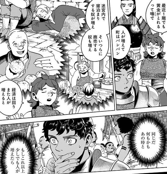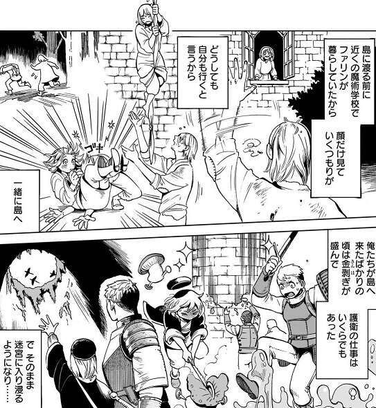 チェンジリングの変化も元に戻り、ライオス達はさらに迷宮を進むと自動トロッコがあり、このトロッコに乗ってしばらく進むことにします。トロッコの中でセンシからライオス達兄妹がなぜ冒険者をしているのかと聞かれ、ライオスは迷宮のある島に辿り着いた経緯を話します。ライオスは10代の頃、故郷の村に嫌気がさして一人町の学校へ行って兵隊に入ります。しかしそこにも馴染めず転々としながら、途中ファリンと合流して兄妹一緒に島へ辿り着きます。