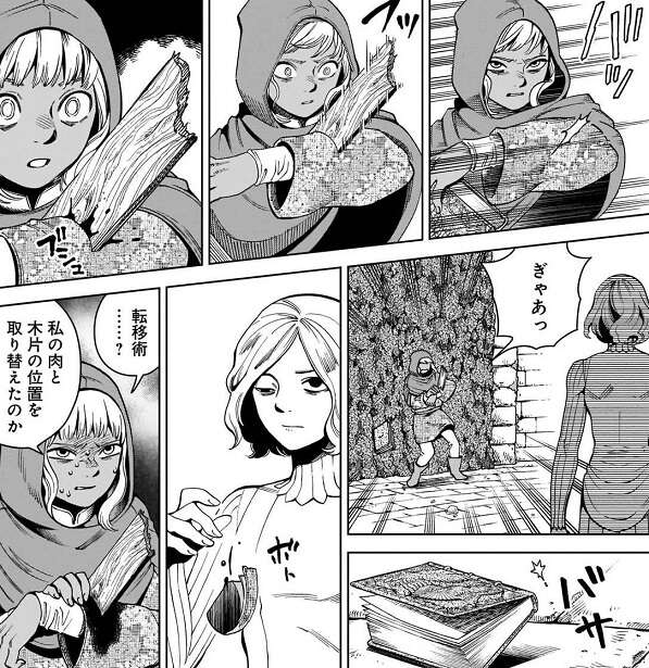 迷宮内の混乱を察知して出てきた狂乱の魔術師を捕らえようとミスルンは、大歩き茸は部下に任せて、狂乱の魔術師と直接対決します。迷宮の魔術師は魔力の薄い地上付近では出来る事が限られているようで、ミスルンの転移術相手に何もできず、さらに魔術書も落としてしまい、地上に飛ばされそうになります。